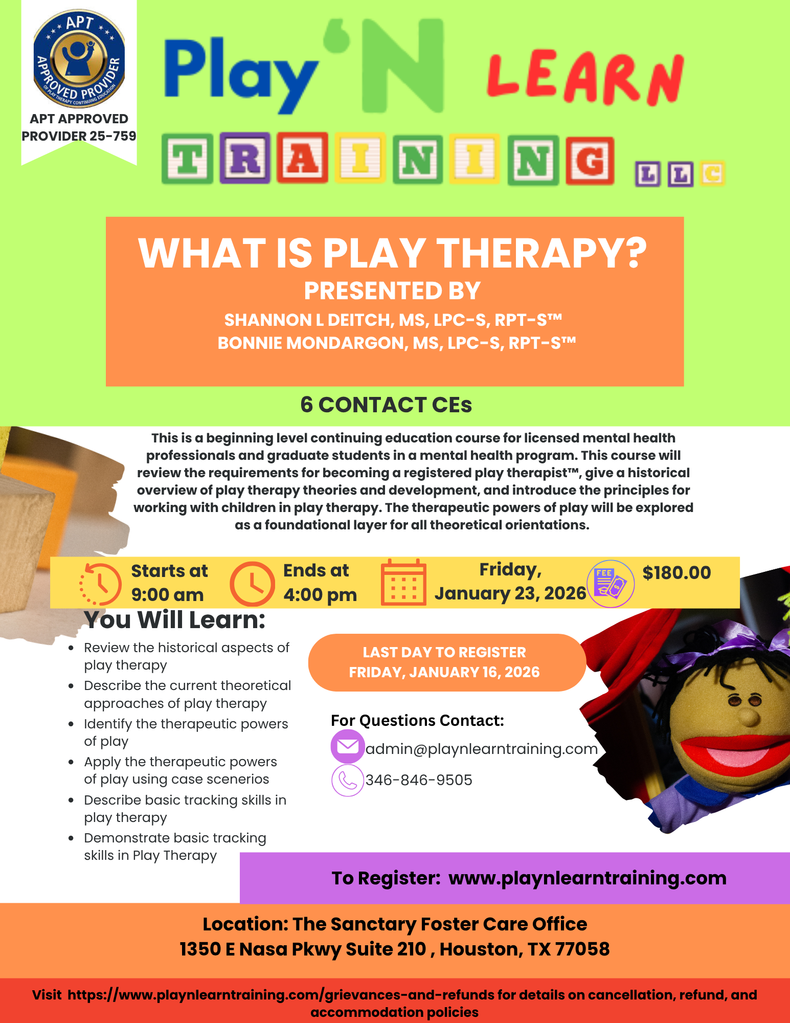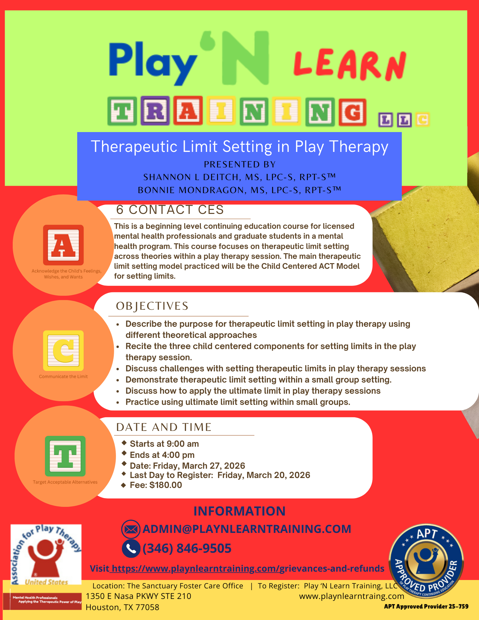 Store Course 1: What is Play Therapy? $180.00 Course 2: Basic Skills in Play Therapy: Tracking, Reflecting Feelings, and Reflecting Content $180.00 Course 3: Therapeutic Limit Setting in Play Therapy $180.00 Course 4: Your Play Therapy Playbook: The paperwork you need to support parents from intake to termination $180.00 Course 5: Themes in Play Therapy $180.00 Course 6: Developmentally Appropriate Play and Ethical Considerations $180.00 Course 7: Play Therapy with Families $180.00